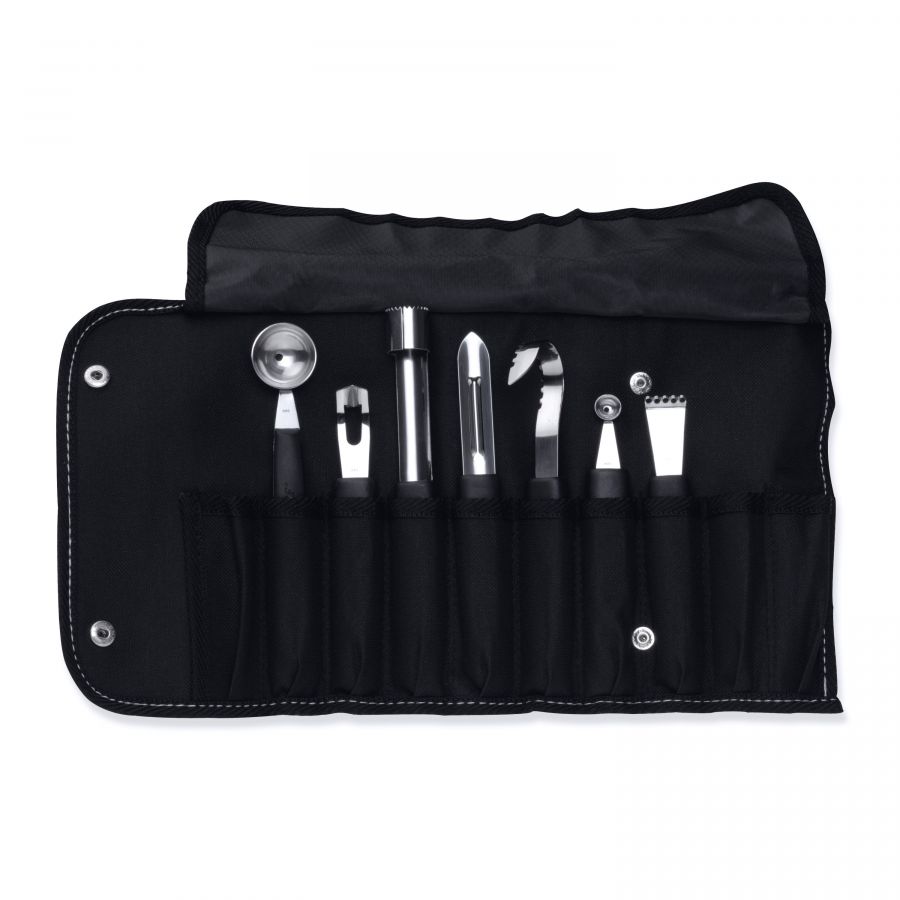 Bolinhas de melão perfeitamente regulares, cachos de manteiga elegantes ou coberturas de cocktails, este conjunto de catering permite preparar e decorar uma grande variedade de frutas, vegetais e outros alimentos. Cada peça tem um cabo de polipropileno confortável e um corpo de aço inoxidável resistente. O conjunto vem numa bolsa dobrável para um fácil transporte e armazenamento