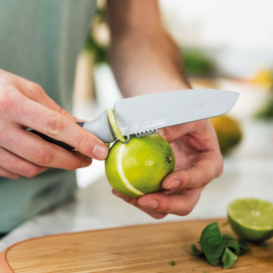 Couve, salada, beringela… o que quiser, com a Faca de legumes Leo pode fatiar, picar, descascar e também aparar. A lâmina antiaderente desliza por todos os tipos de vegetais, enquanto o zester integrado permite adicionar um toque frutado aos seus pratos sem se cansar.  A faca possui uma capa protetora para.