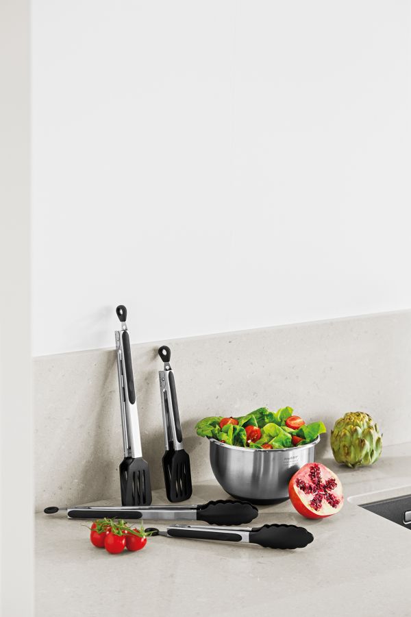Uma boa espátula é uma daquelas coisas que você não pode prescindir na cozinha. Seja a fazer um saboroso naco de carne ou a servir uma deliciosa salada, esta espátula com cabo antideslizante é exatamente o que você precisa para agarrar bem os seus alimentos. As cabeças de nylon são adequadas para panelas antiaderentes e o mecanismo de travar  ajuda a manter as pinças fechadas quando as quer guardar numa gaveta ou simplesmente pendurar