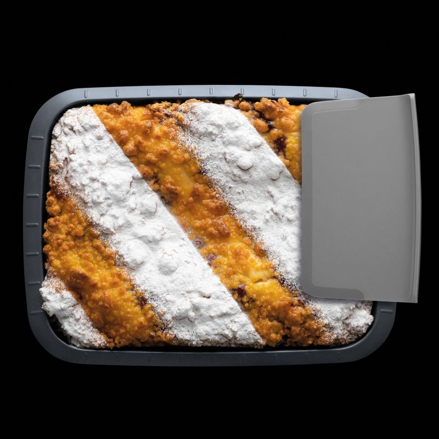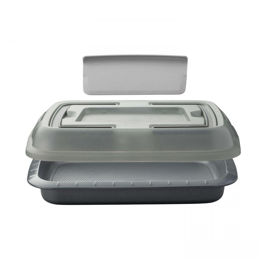 Graças à sua tampa com alças dobráveis para fácil transporte, a forma com tampa e fatiador é o seu companheiro ideal! E se isso não for tão bom, a tampa também tem um fatiador integrado de fácil utilização. A forma do bolo em si é feita de aço carbono leve com um revestimento antiaderente de alta qualidade e apresenta linhas de pontuação para um porcionamento fácil e justo