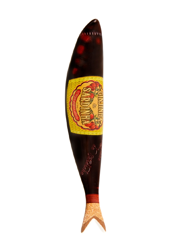 Um dia, na cozinha de um velho lisboeta que preparava licor de ginja, uma sardinha entrou dentro duma garrafa de ginjinha artesanal para comer um fruto de ginja. Aí, o vidro deformou-se e a garrafa ficou assim. Desde aquele dia o homem decidiu pôr um nome ao seu licor em honra da sardinha e chamou-o “Ginjinha da Sardinha”. Designer: Simone Dezaiacomo