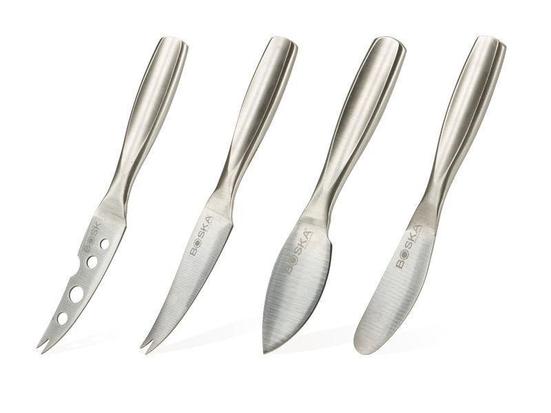 Você precisa de diferentes tipos de facas para cortar diferentes tipos de queijo. Este conjunto é a solução perfeita, pois contém quatro facas diferentes de aço inoxidável de alta qualidade. Espalhe um delicioso queijo de ervas, corte os queijos macios com um movimento suave, corte os queijos semi-duros com a faca de apresentação e pode usar aponta biforcada para pegar um pedaço de queijo e passá-lo para outra pessoa e ainda pode cortar os queijos duros com a faca parmesão.