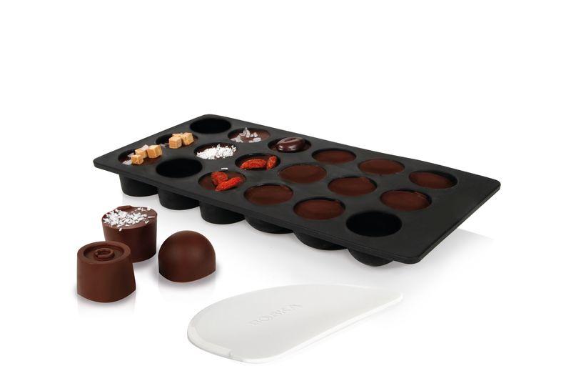 Caracteristicas: Conjunto onde tem tudo o que precisa para fazer os mais deliciosos bombons de chocolate: um molde de silicone, um raspador e receitas. A única coisa que precisa adicionar é chocolate derretido eum qualquer tipo de recheio. O molde de silicone é flexível. Seguro para micro-ondas
