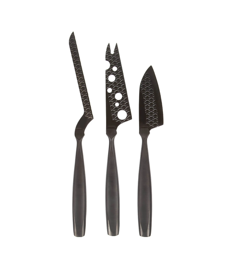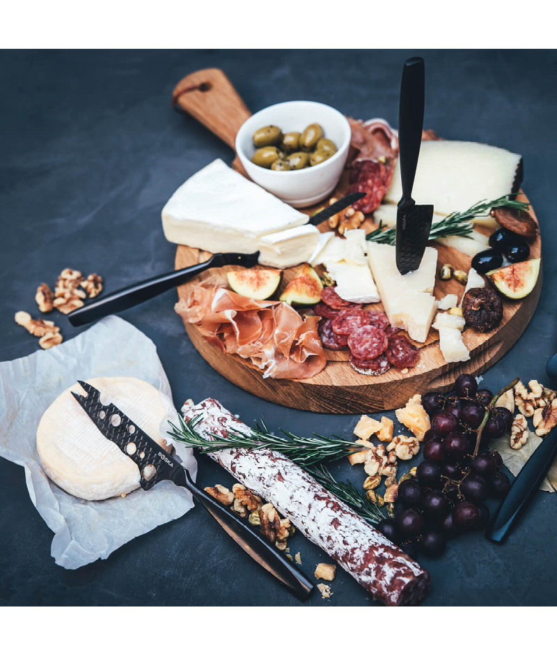 Use a faca com os furos na lâmina e a faca com a lâmina estreita para cortar queijos macios e semi-duros. O revestimento preto exclusivo e o padrão acolchoado nas lâminas tornam as facas extra antiaderentes. Com a faca restante, você pode cortar os queijos mais duros com facilidade