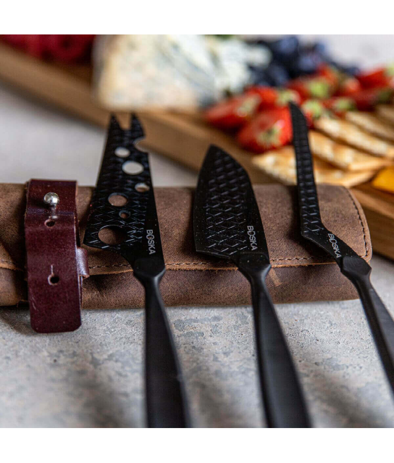 Procura o presente perfeito? O Conjunto de Facas para Queijo Monaco +Preto, graças à sua cor única e à bolsa de couro, é o presente perfeito para qualquer ocasião festiva