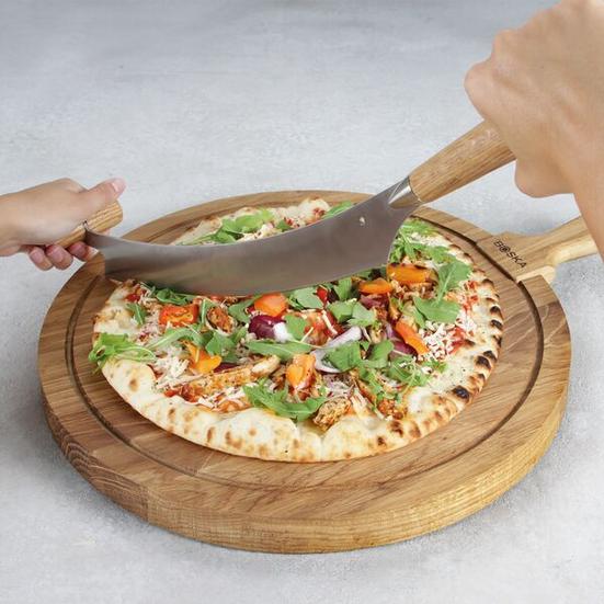 Graças à faca semi-circular, pode cortar queijo semi-duros a muito duros ou pizza com um simples movimento de balanço. As pegas de carvalho dão à faca uma aparência natural. Além disso, você trabalha com mais segurança, porque usa as duas mãos durante o corte.