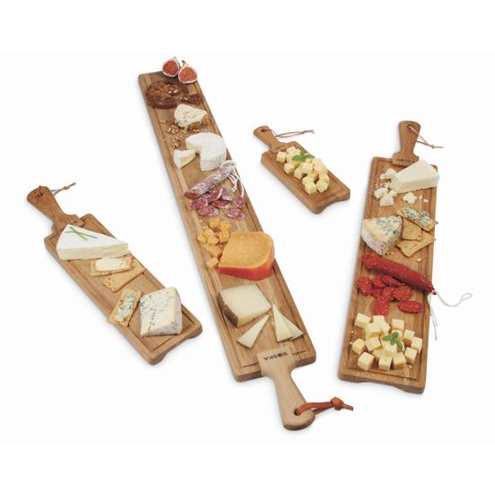 Esta tábua de queijos destaca-se pela sua aparência rústica e acabamento de bom gosto. Pode ser usado como um delicioso prato de degustação de queijos ou como uma saborosa tábua de tapas. Apresente salgadinhos de queijo, molhos, tapas e outros acompanhamentos neste design retangular.