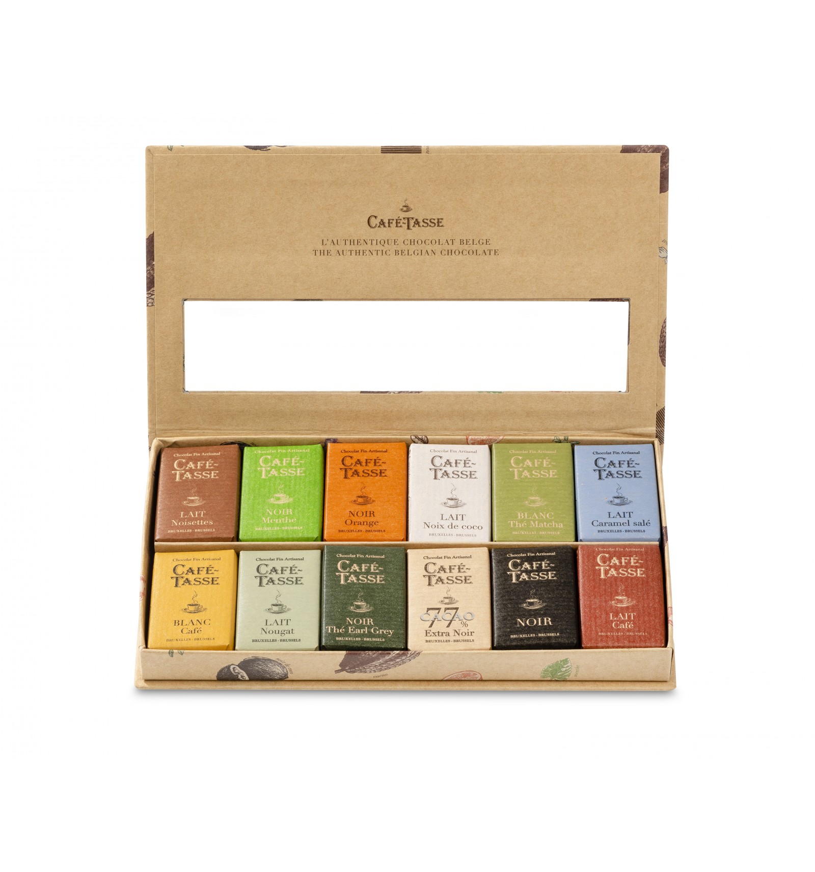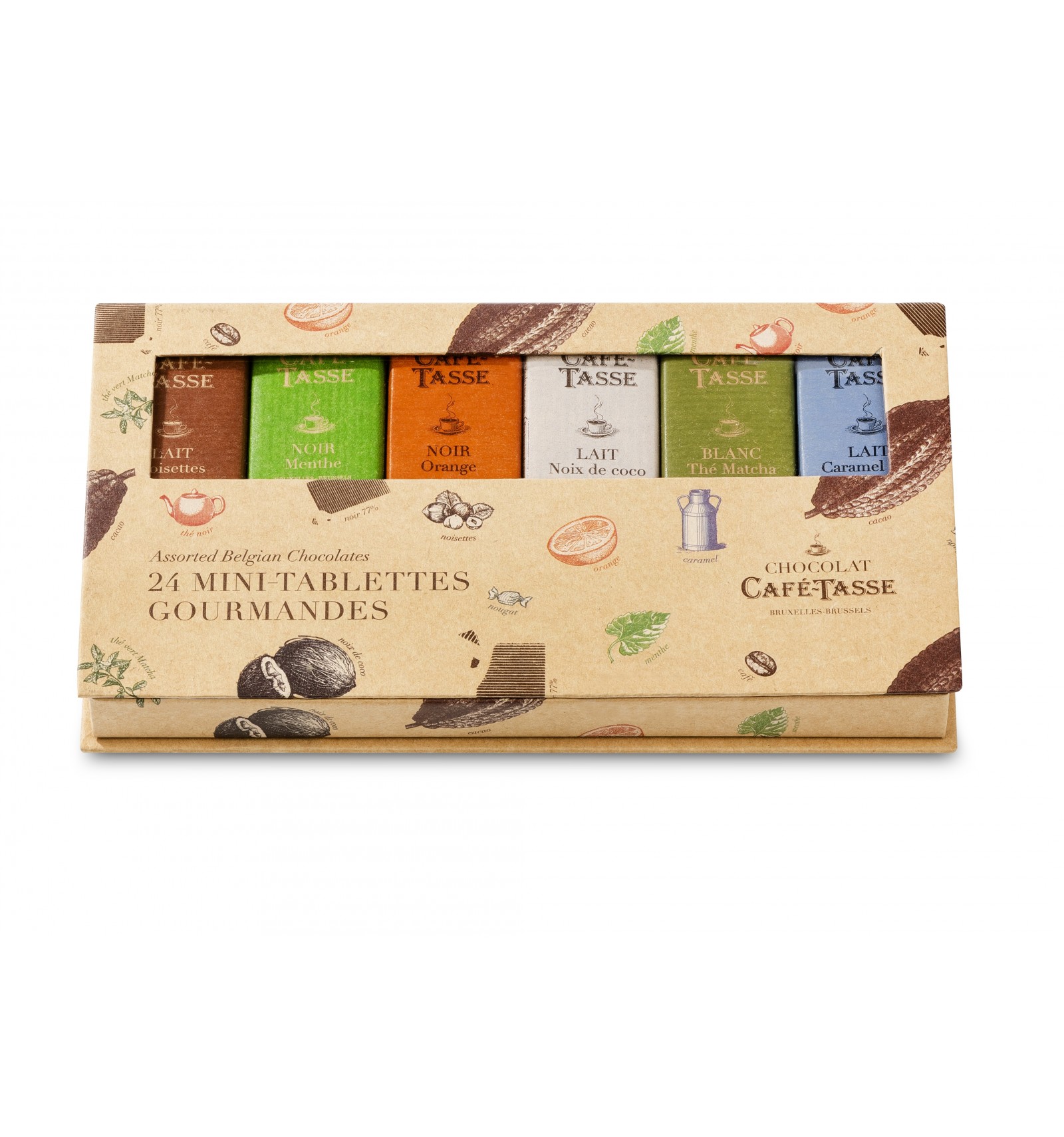 Caixa com 24 mini tabletes sortidas ( Menta escura, earl Grey escura, laranja escura, leite com café, leite com coco, leite com nougat, café branco, chá branco e matcha, leite com caramelo e escuro 77%
