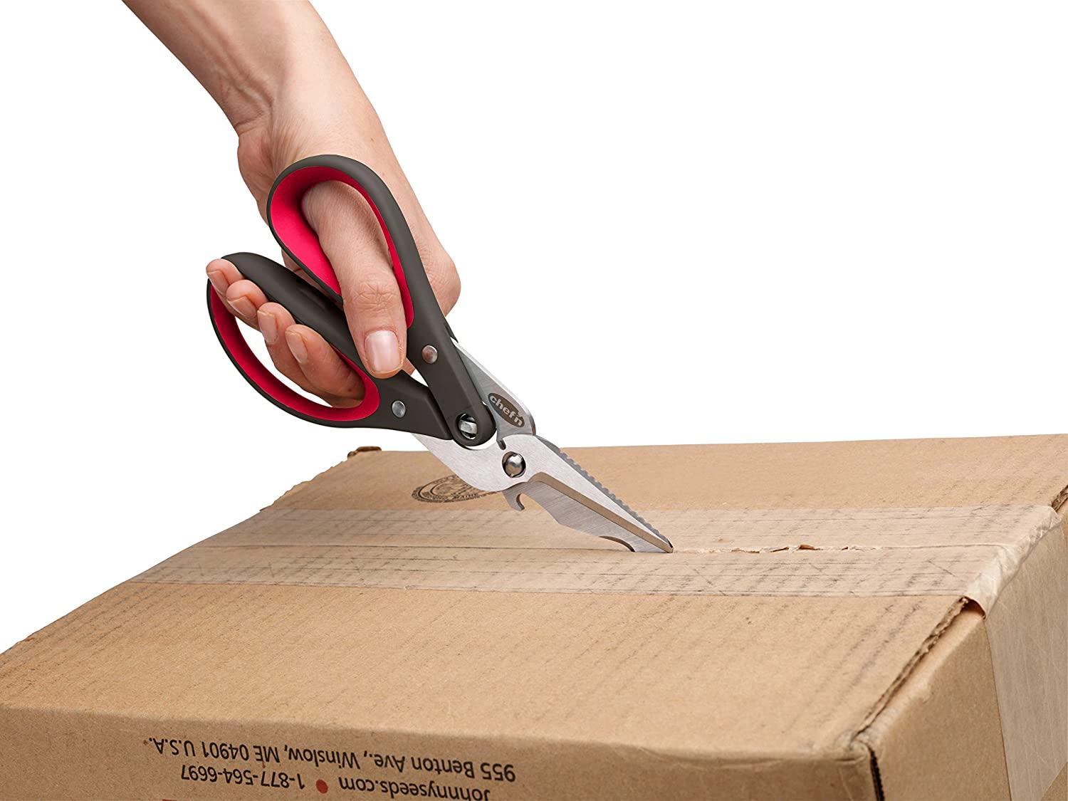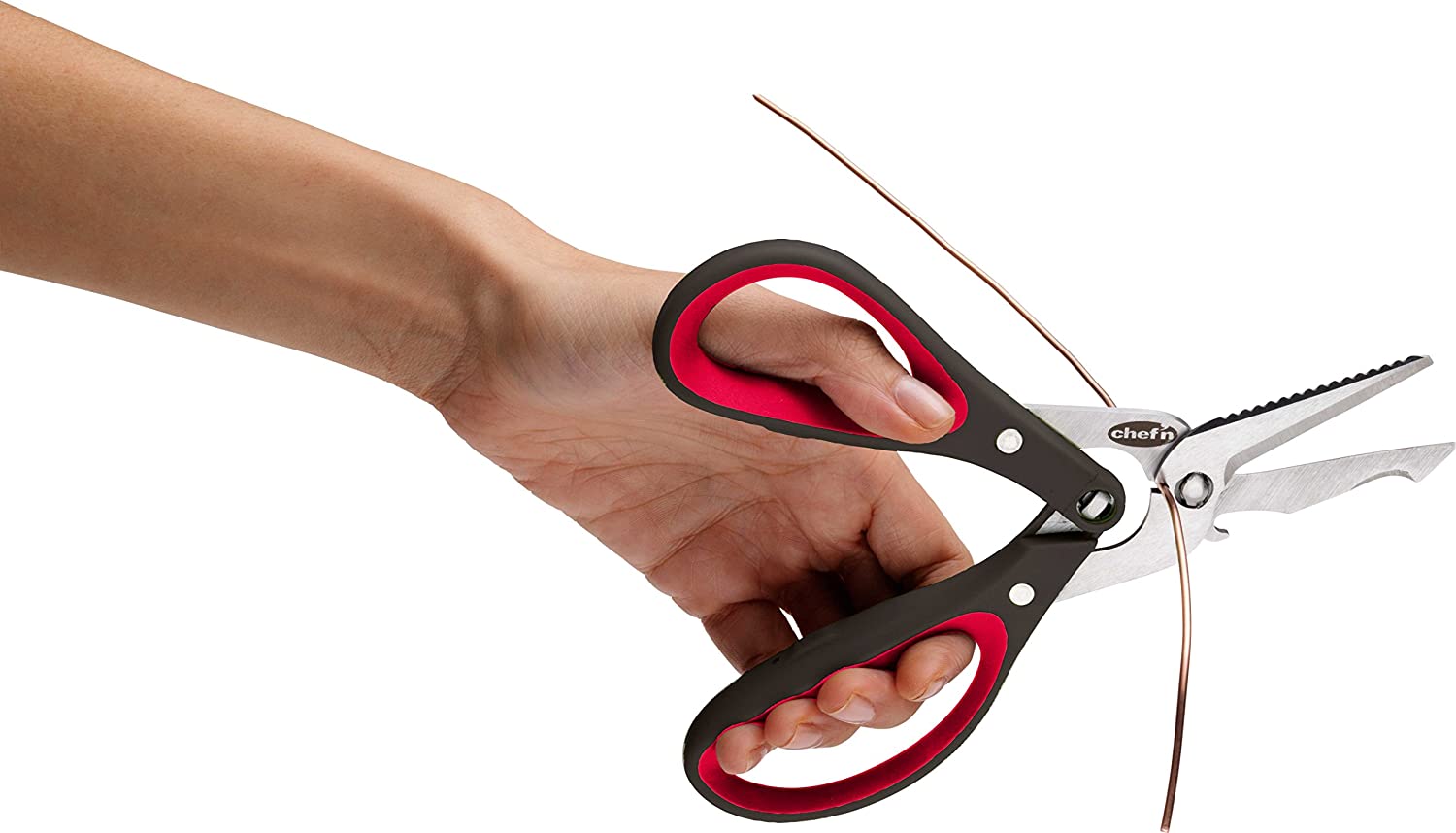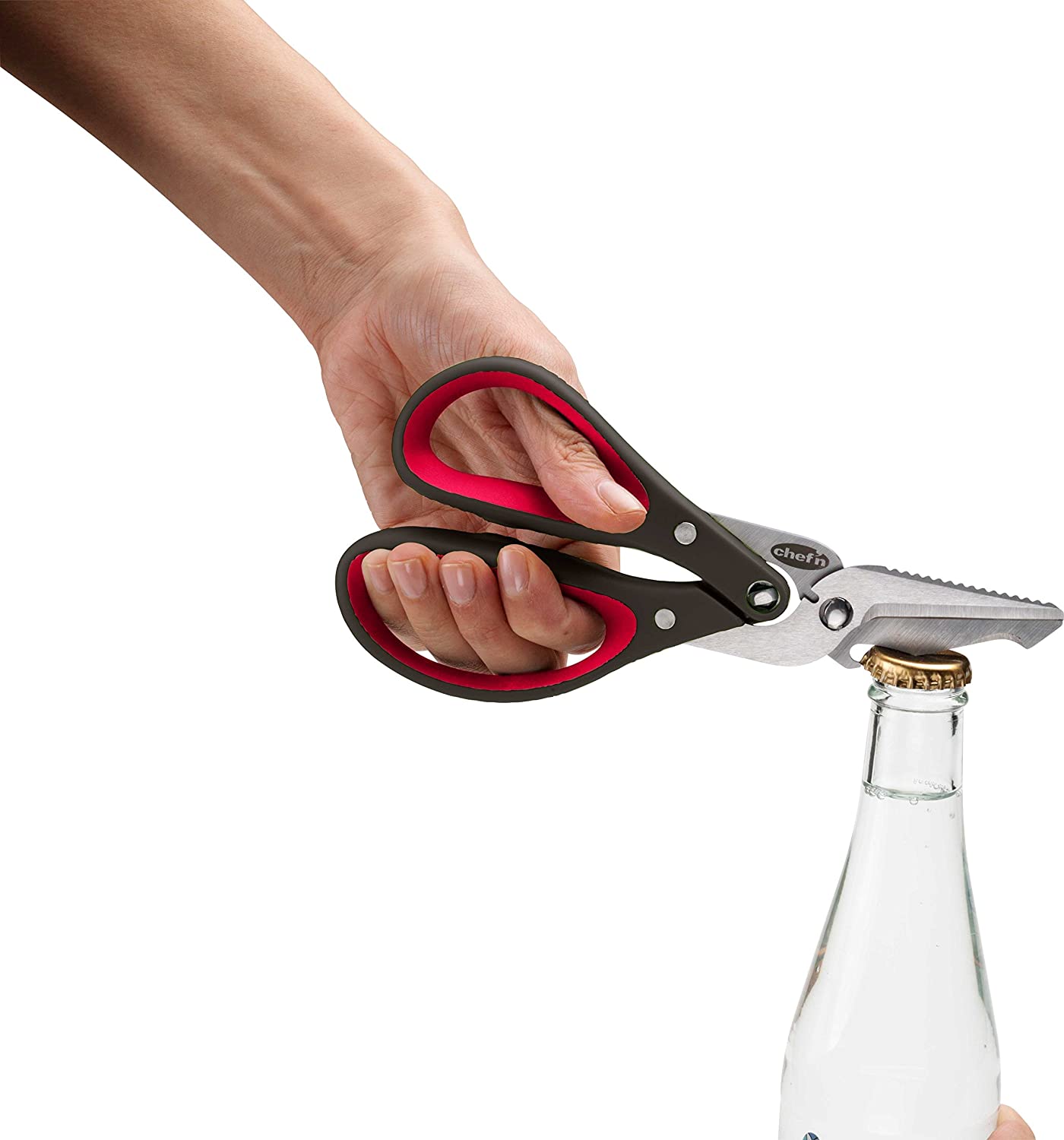 Caracteristicas: 5 funções em 1. Tesouras de cozinha para todos os fins.Abridor de garrafas e cortador de fio integrados. Quebre o papelão com a serra embutida. Perfure e corte a fita da embalagem com a ponta angular da lâmina. Mecanismo de dupla engrenagem aumenta a alavancagem. Empurre as alças para a posição horizontal para separá-las para limpeza. Lâminas em aço inoxidável