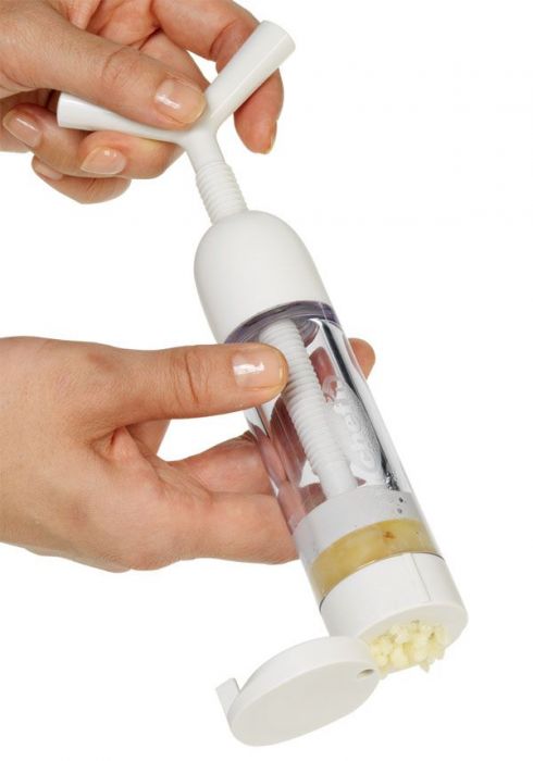 Não pique palavras, pique alho com a conveniente Garlic Machine. O novo design aprimorado da máquina apresenta uma tampa de liberação rápida para facilitar o carregamento. Insira vários dentes de alho descascados e simplesmente gire a alça para pressionar e picar. Uma tampa de armazenamento integrado mantém o alho fresco e pronto para uso.