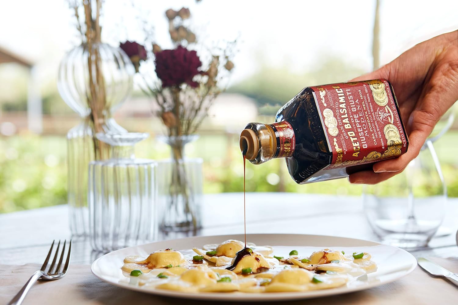 - Vinagre balsâmico de sabor rico oferece um sabor espesso e doce com notas de geléia de ameixa, frutas vermelhas, mel e baunilha, é adequado para risotos, carnes, vegetais, ovos, peixes, frutas e sobremesas