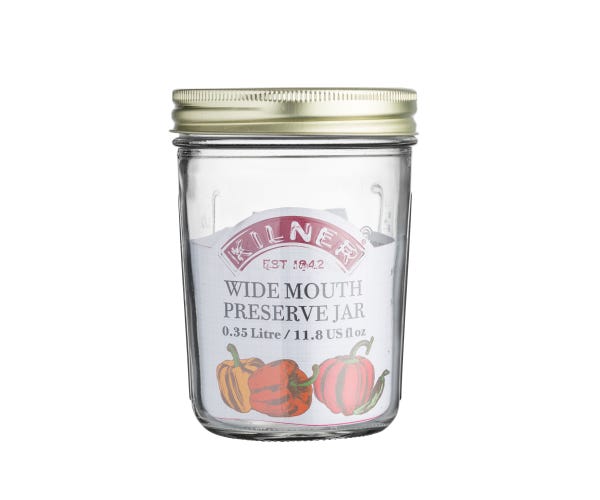 O Frasco de conserva de boca larga Kilner é perfeito para armazenar e conservar alimentos saudáveis e produzidos em casa. Possui um sistema de tampa de 2 peças que compreende um disco de estanho e uma faixa de rosca garantindo uma vedação segura a vácuo, mantendo o conteúdo fresco por mais tempo. A capacidade do frasco é de 0,35 litros / 350ml, ideal para conservar frutas e vegetais inteiros