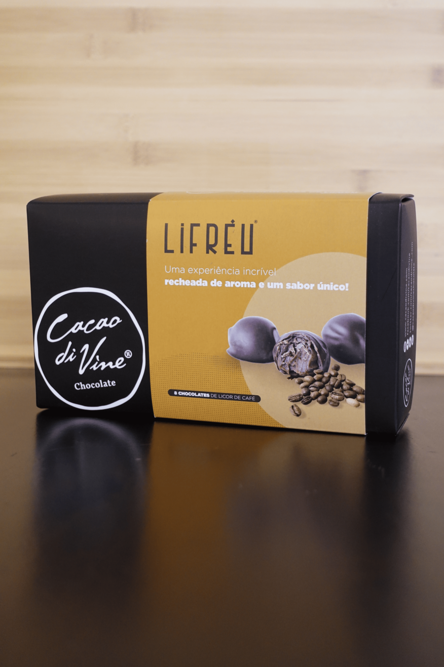 Ingredientes: Chocolate (70%) (pasta de cacau, açúcar, manteiga de cacau, emulsionante: lecitina de soja, aroma natural de baunilha), licor de café lifréu (28%), xarope de glucose, espessante (sorbitol) e flor de sal