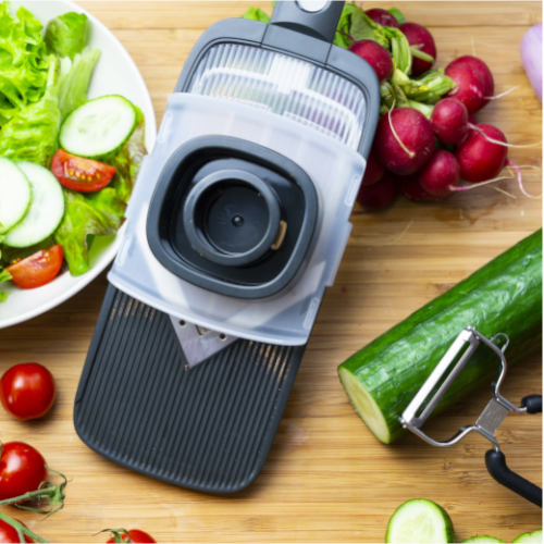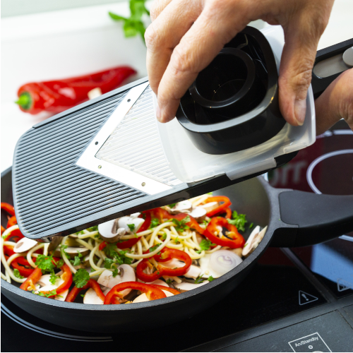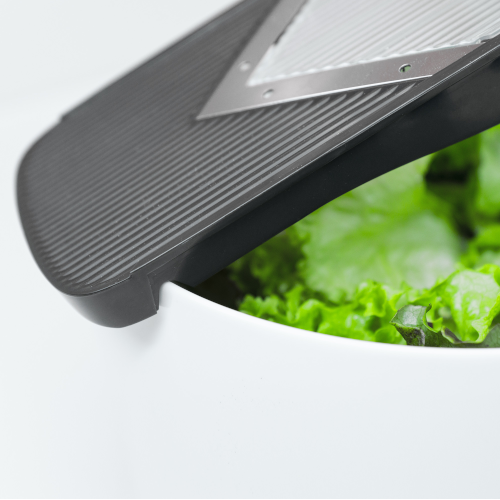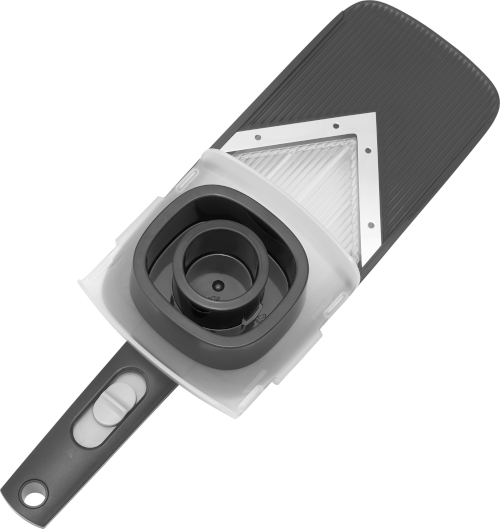 Com a Mandolina de Corte em V, oferecemos-lhe um ajudante de cozinha para cortar rapidamente frutas e legumes. Graças à lâmina em forma de V é possivel alcançar resultados de corte uniformes de forma fácil, rápida e segura