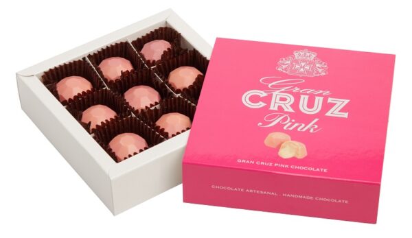 O melhor vinho combinado com o melhor chocolate. Caixa com deliciosos bombons de chocolate branco com recheio de vinho Gran Cruz Pink.