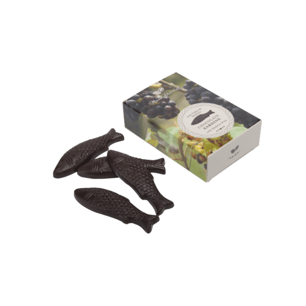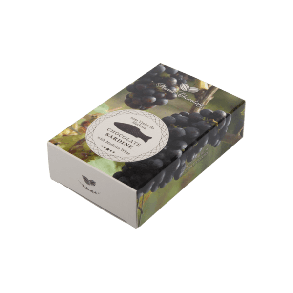 Lata de sardinha de chocolate negro com recheio de vinho da Madeira, em lata original de conserva. Tradição combinada com o delicioso sabor Português