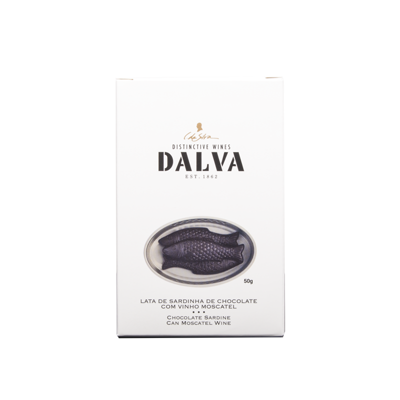 O melhor vinho Moscatel combinado com o melhor chocolate. Caixa com 4 deliciosas sardinhas de chocolate negro com recheio de vinho Dalva Moscatel