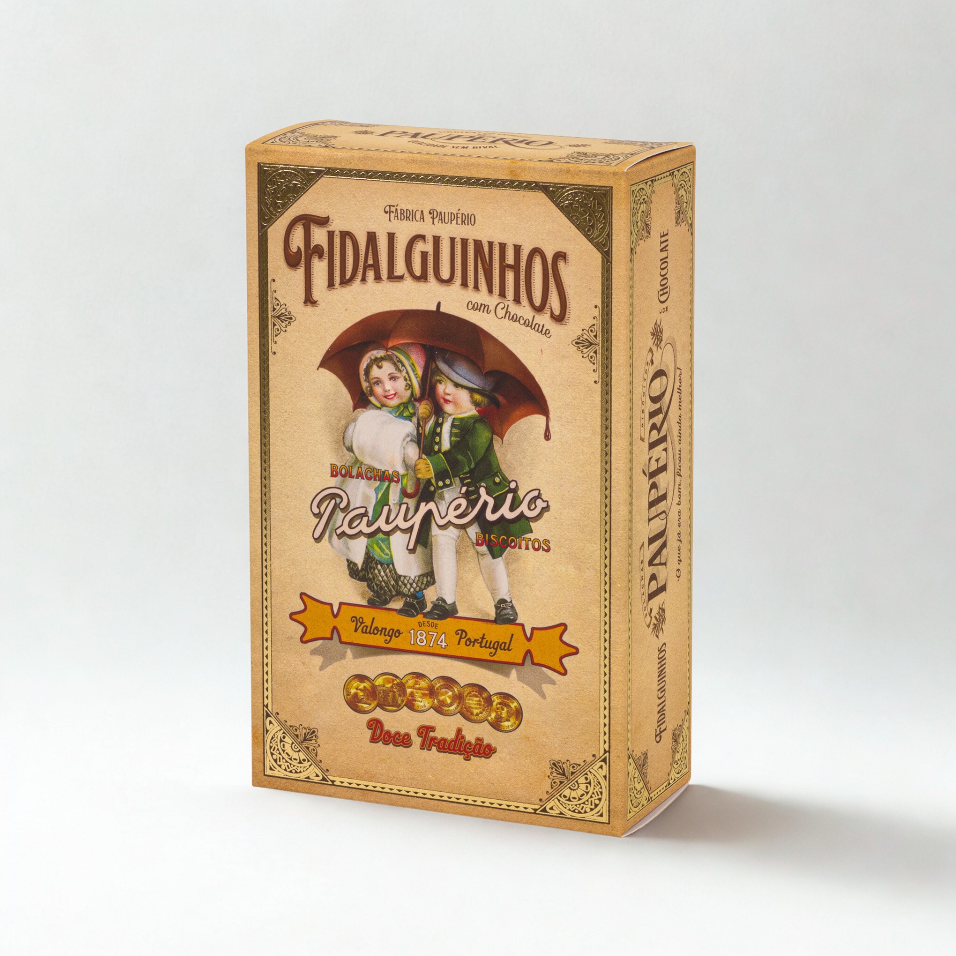 Um dos biscoitos mais icónicos da Fábrica Paupério ganhou uma nova e deliciosa versão. Os Fidalguinhos, delgados, crocantes e cheios de curvas, foram agora cobertos por uma película de intenso chocolate, rico em cacau, que realça o seu sabor inconfundível. Apresentam-se numa elegante caixa cartonada, com ilustrações que nos transportam às memórias doces da infância. Um clássico reinventado, feito para conquistar novos paladares… e fazer sorrir os de sempre.