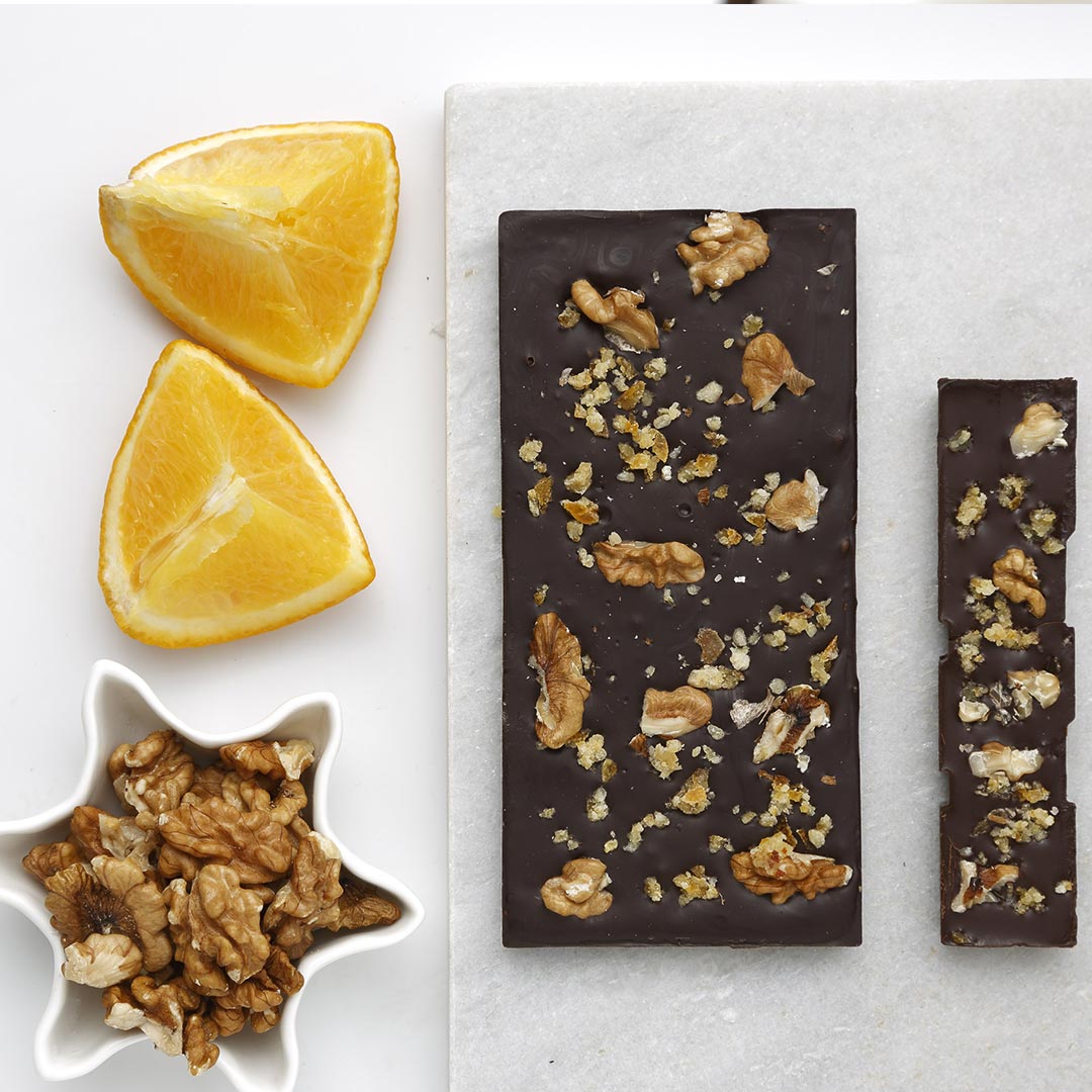 A tablete vegan de chocolate negro com laranja e noz junta a um clássico intemporal – chocolate e laranja – um toque crocante, conquistando pela textura e pela excelência dos ingredientes.