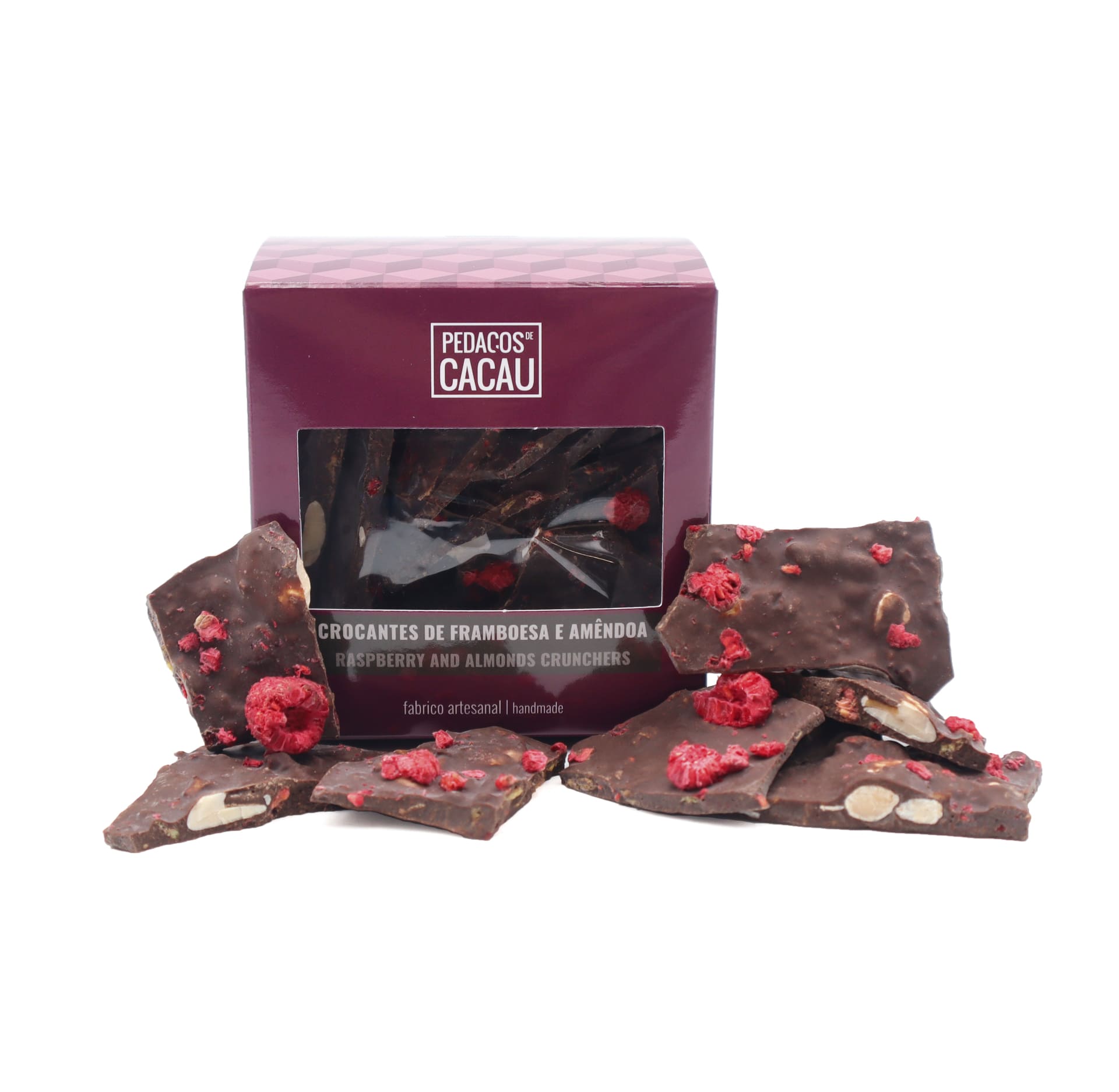 Caracteristicas: Crocantes de Framboesa e Amêndoa com Chocolate Negro (60% cacau), Fabrico artesanal, 100% Português. Pode conter vestígios de GLÚTEN, OVOS, LEITE e frutos de casca rija.Temperatura de consumo: 15º - 20º C.
