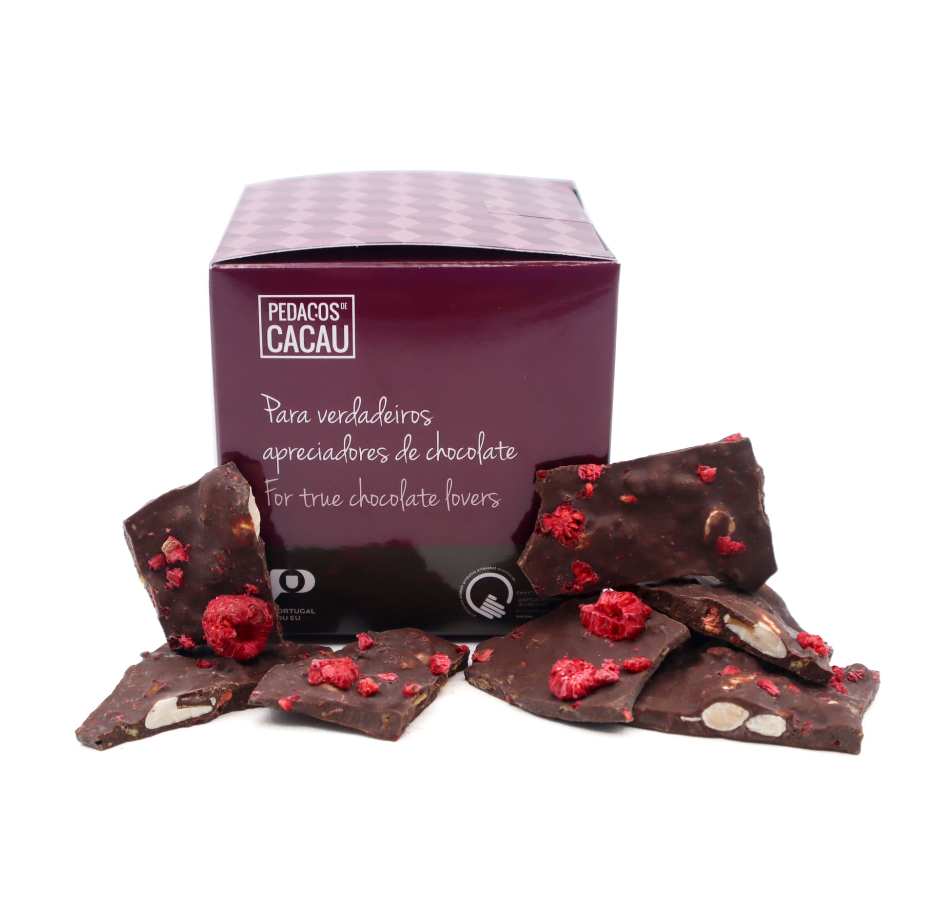 Pedaços de Cacau Crocantes de Framboesa e Amêndoa Fabrico Artesanal