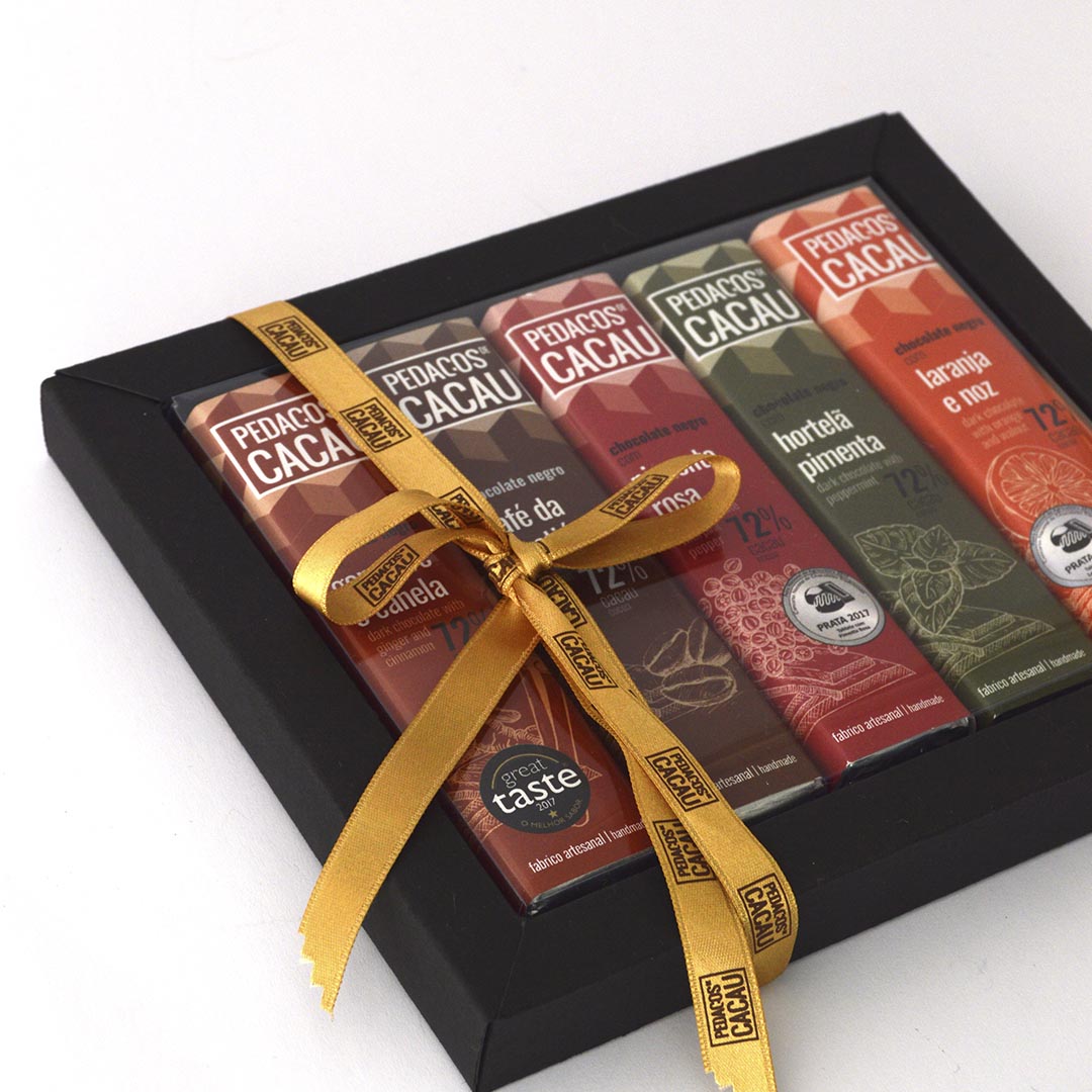O Kit de Degustação é composto pela Coleção Completa de Tabletes Artesanais, ou seja, dez tabletes vegan de chocolate negro artesanal (72% de cacau) com uma mistura de sabores tradicionais com sabores irreverentes. É um presente de sonho para verdadeiros apreciadores de chocolate, que terão oportunidade de experimentar uma ampla diversidade de chocolates artesanais e de eleger os seus preferidos.