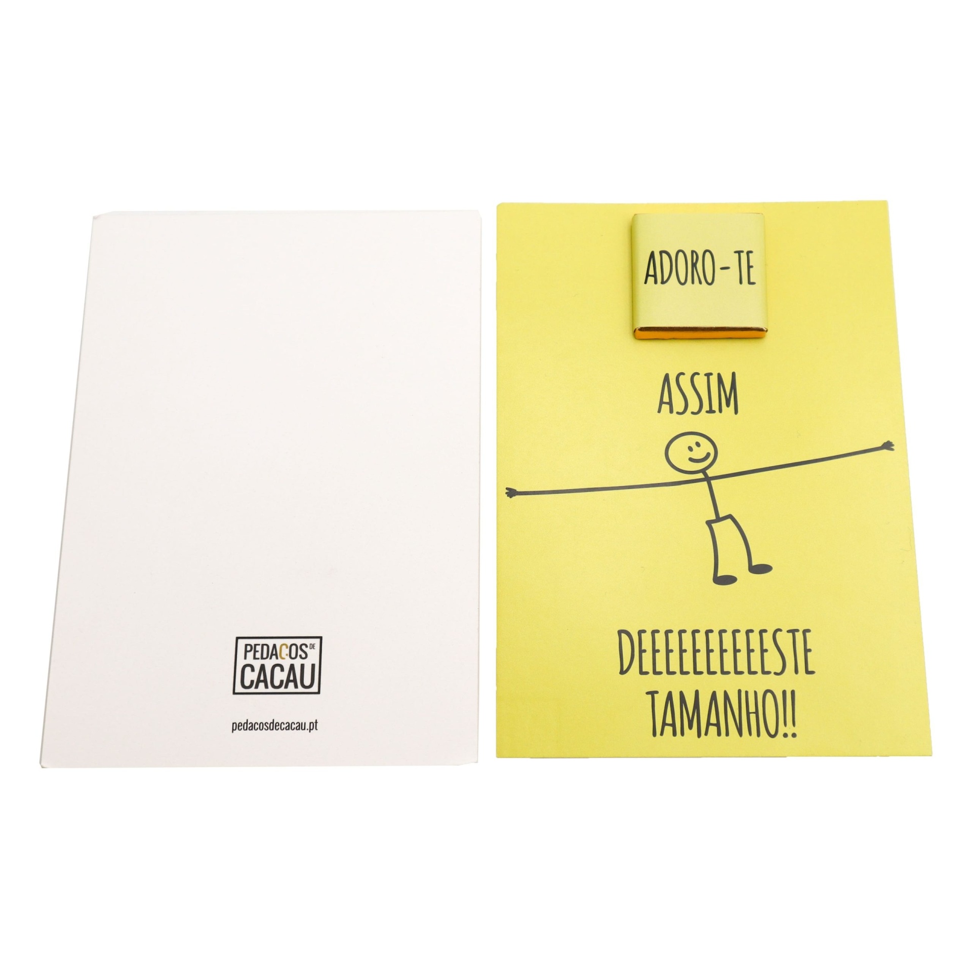 Caracteristicas: Postal com uma napolitana de chocolate negro vegan (min. 72% de cacau) e mensagem: “Adoro-te Assim Deste Tamanho". Pode conter vestígios de GLÚTEN, OVOS, LEITE e frutos de casca rija. Fabrico Artesanal, Sem Corantes nem Conservantes. PRODUTO VEGAN - Isento de ingredientes de origem animal e não testadas em animais