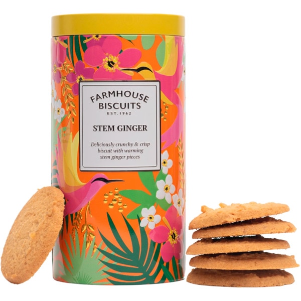 Lata Tropical vibrante e com relevo que contém bolachas deliciosamente crocantes com pedaços de gengibre, que têm tanto de reconfortantes como de saborosas. O presente perfeito para alguém especial — ou um mimo merecido só para si