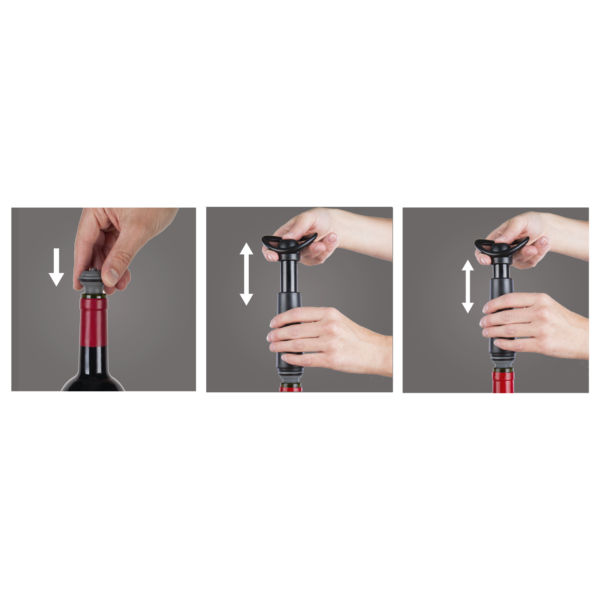 Extraia o ar da sua garrafa de vinho aberta com a Bomba de Vácuo Manual e feche-a novamente com uma rolha de garrafa de vinho de borracha reutilizável. Basta inserir a rolha de vinho universal no gargalo e bombear até ouvir o som de “clique”. Isso indica que atingiu o nível de vácuo hermético. Sirva o seu vinho sem pingar com o apara pingas.