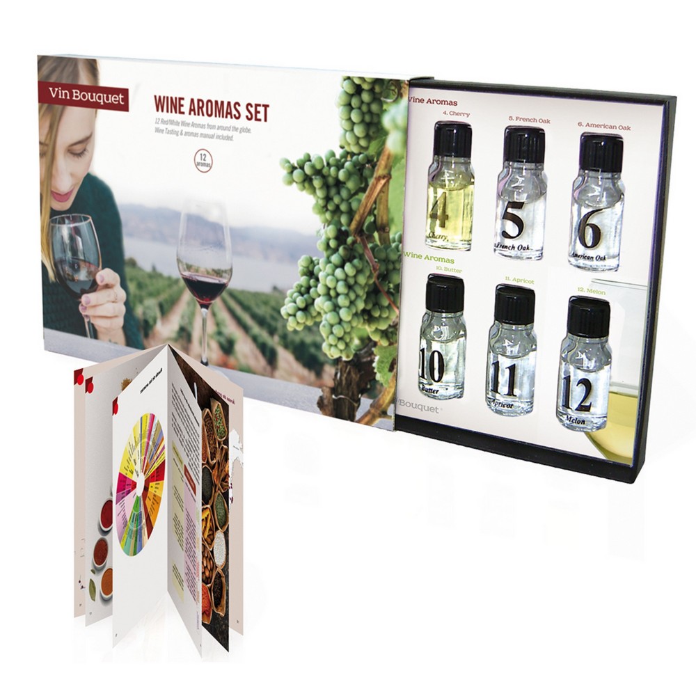 • Contém 6 garrafas com aromas encontrados no vinho tinto e 6 no vinho branco, além de um livro com explicações e descrições de cada um deles.