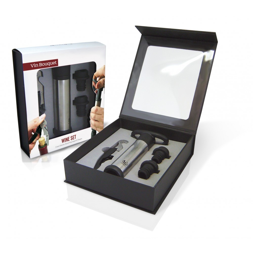 Este conjunto de vinhos é perfeito para ser um excelente anfitrião nas suas reuniões ou para desfrutar sozinho. Inclui os elementos necessários tanto para abrir o vinho como para o conservar. O saca-rolhas de dois tempos possui uma pequena lâmina que permite cortar a cápsula das garrafas